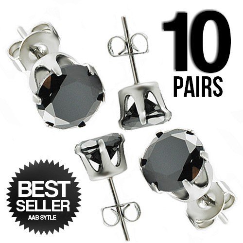 Stainless Steel Black Round CZ Ear Stud- 10 Pairs