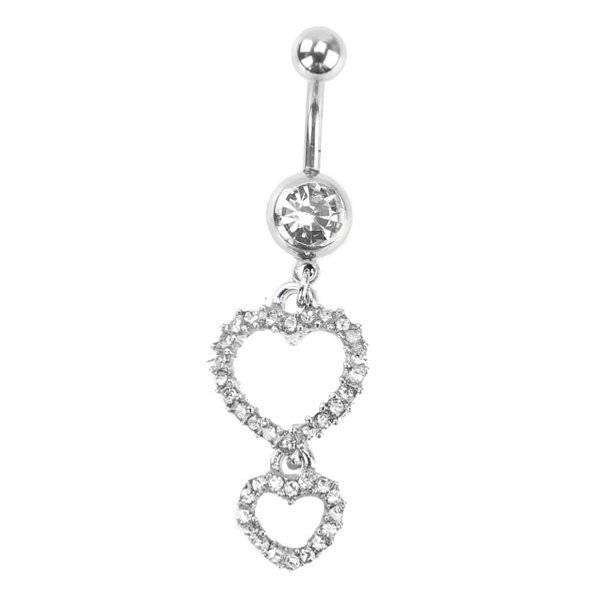 Lovely Surgical Steel Navel Ring With Two Dangling Jeweled Hearts