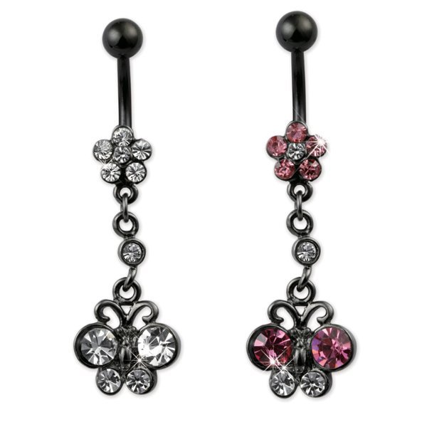 Beautiful Black PVD Coated Navel Ring With Dangling Jeweled Butterfly