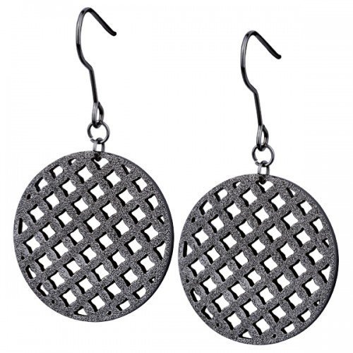 Black Circular Earring With Cutout Diamond Shaped Pattern and Sandblast Texture.