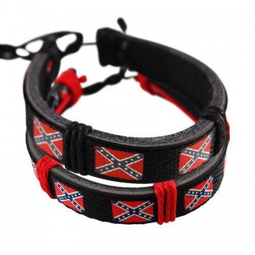 Black Leather Bracelet with American Heritage Confederate Flag Ribbon. This Bracelet Comes With Black or Red Accent String.