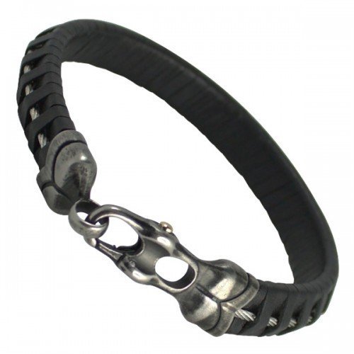 Black Leather Bracelet with Stainless Steel Cable Wire
