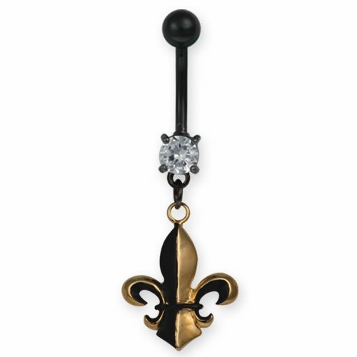 Black PVD Belly Ring With Black And Gold Fleur-De-Lis Dangle
