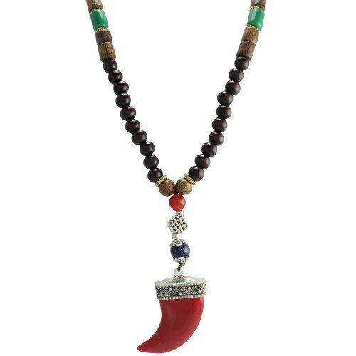 Black Wood Beaded Necklace with Red Tusk Pendant
