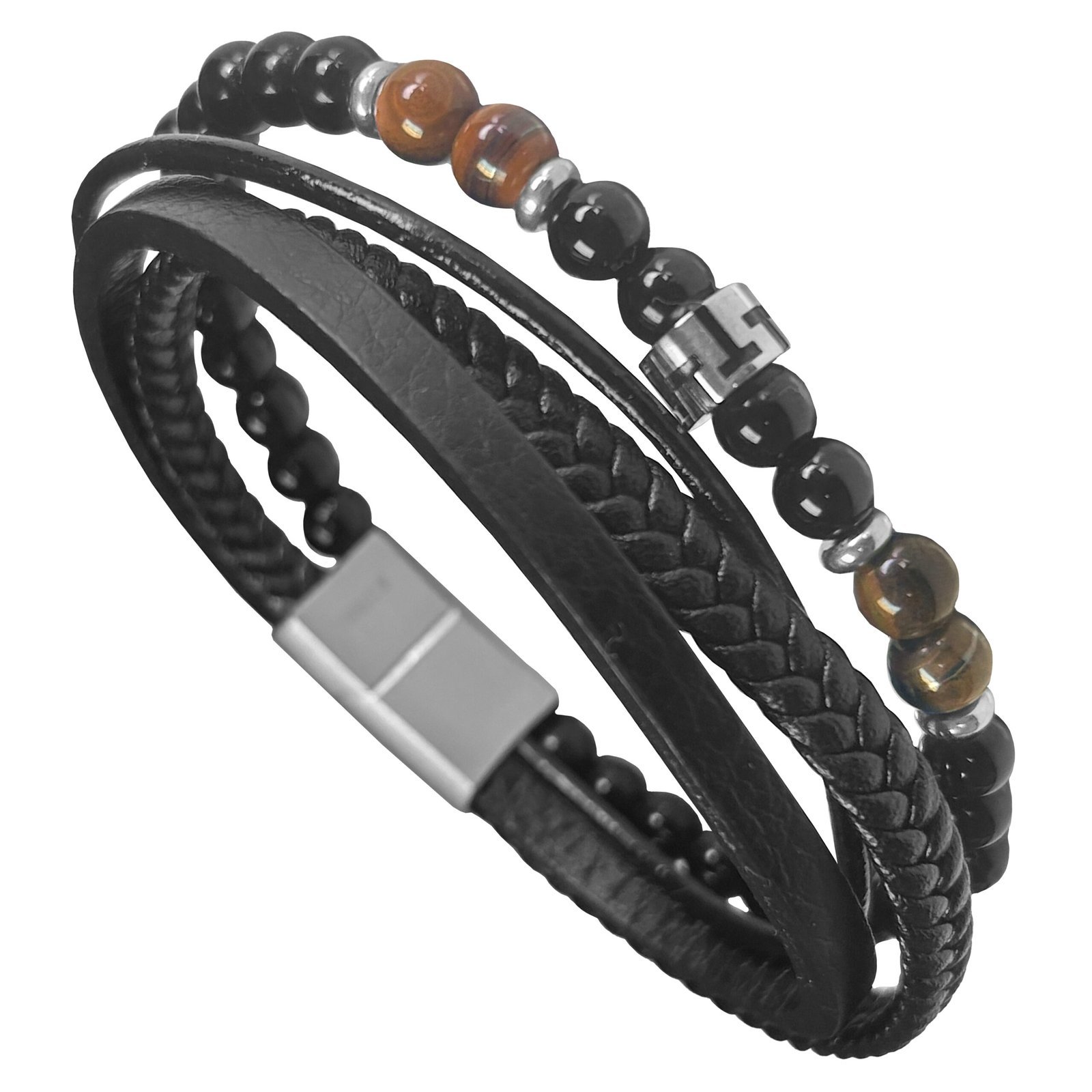 Leather & Tiger Eye and Black Bead Stainless Steel Bracelet