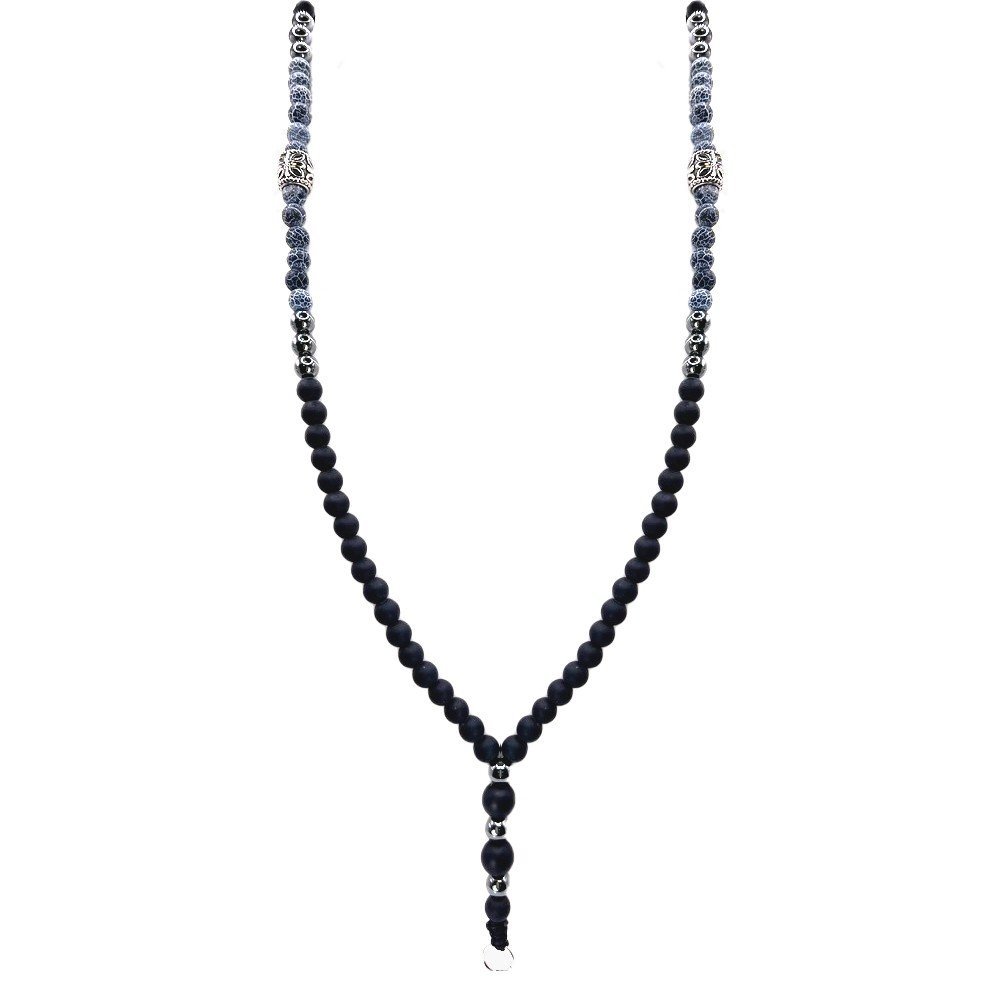 Long Beaded Necklace with Black/Blue Denim & Stainless Steel Bead Accents quantity