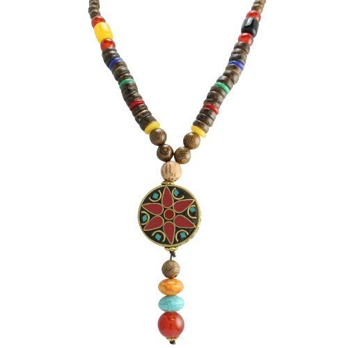 Multi-Color Wood Bead with Red and Gold Dangle Pendant