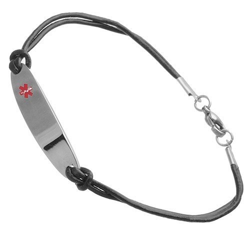 This is another great unisex option for a Medical Alert Bracelet. The leather wrist is slim and Shinny and the plate in Surgical Steel comes with the Medical emblem engraved in Red PVD. This real simple design comes also with a steel lobster clasp which is durable and of great quality.