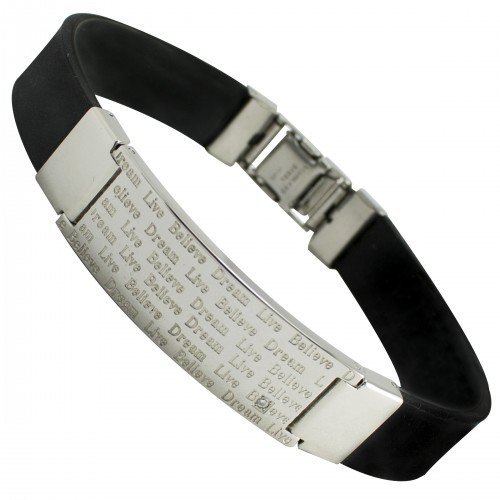 Rubber Bracelet With Stainless Steel Plate Engraved With The Words “Live, Believe, Dream”. Available In Steel And Black PVD.
