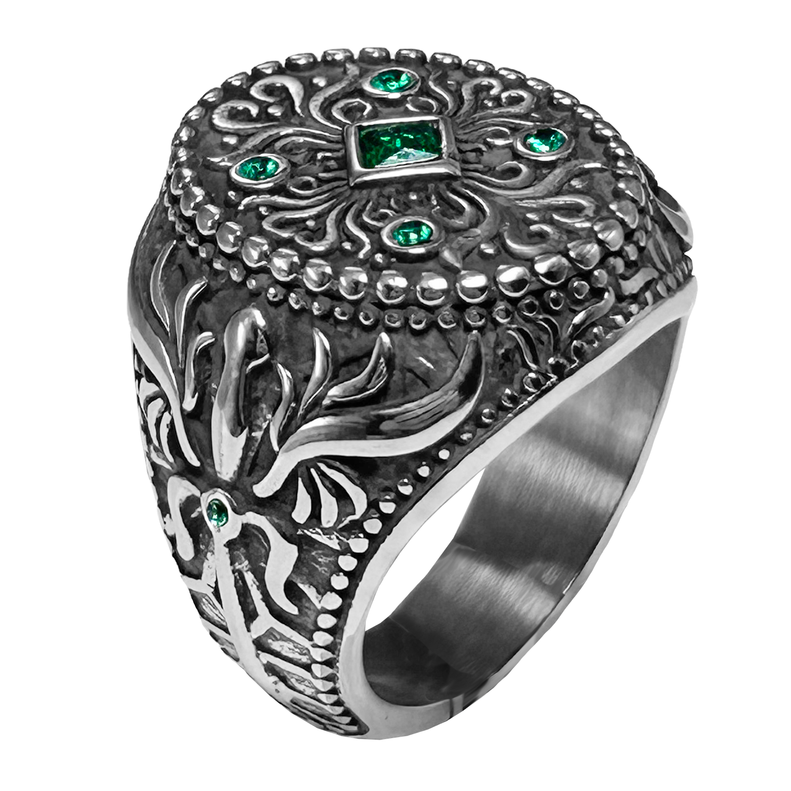 Stainless Steel Biker Ring with Green Stones
