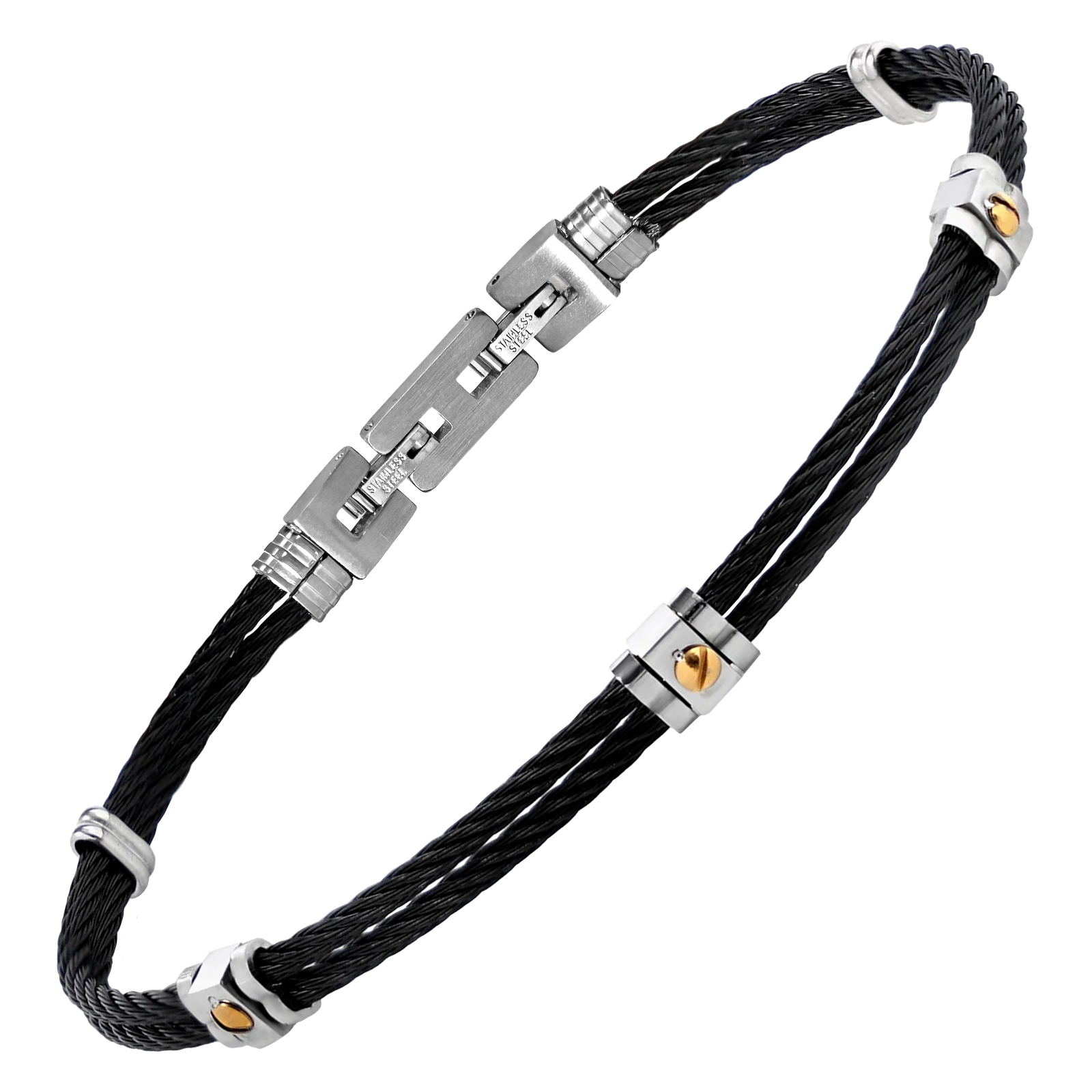Stainless Steel Black Cable Wire Bracelet w/ Tiny Gold Screws