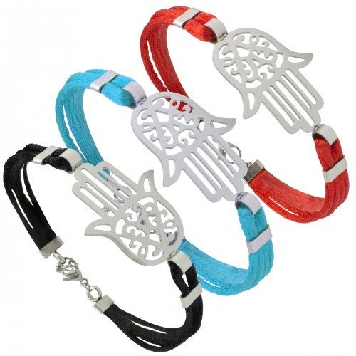 Stainless Steel Bracelet with Black Cord and HAMSA Design
