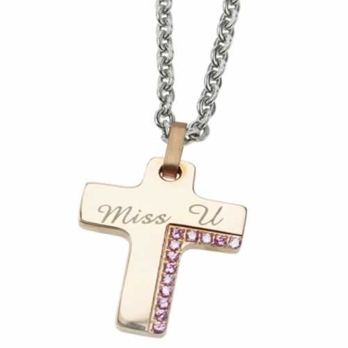 Gorgeous Stainless Steel Rose Gold PVD Couples Cross Pendant with “Miss U”