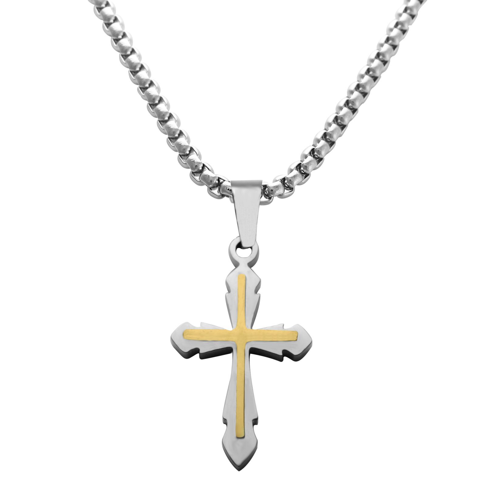 Stainless Steel Cross Pendant in Steel & Gold w/ Chain