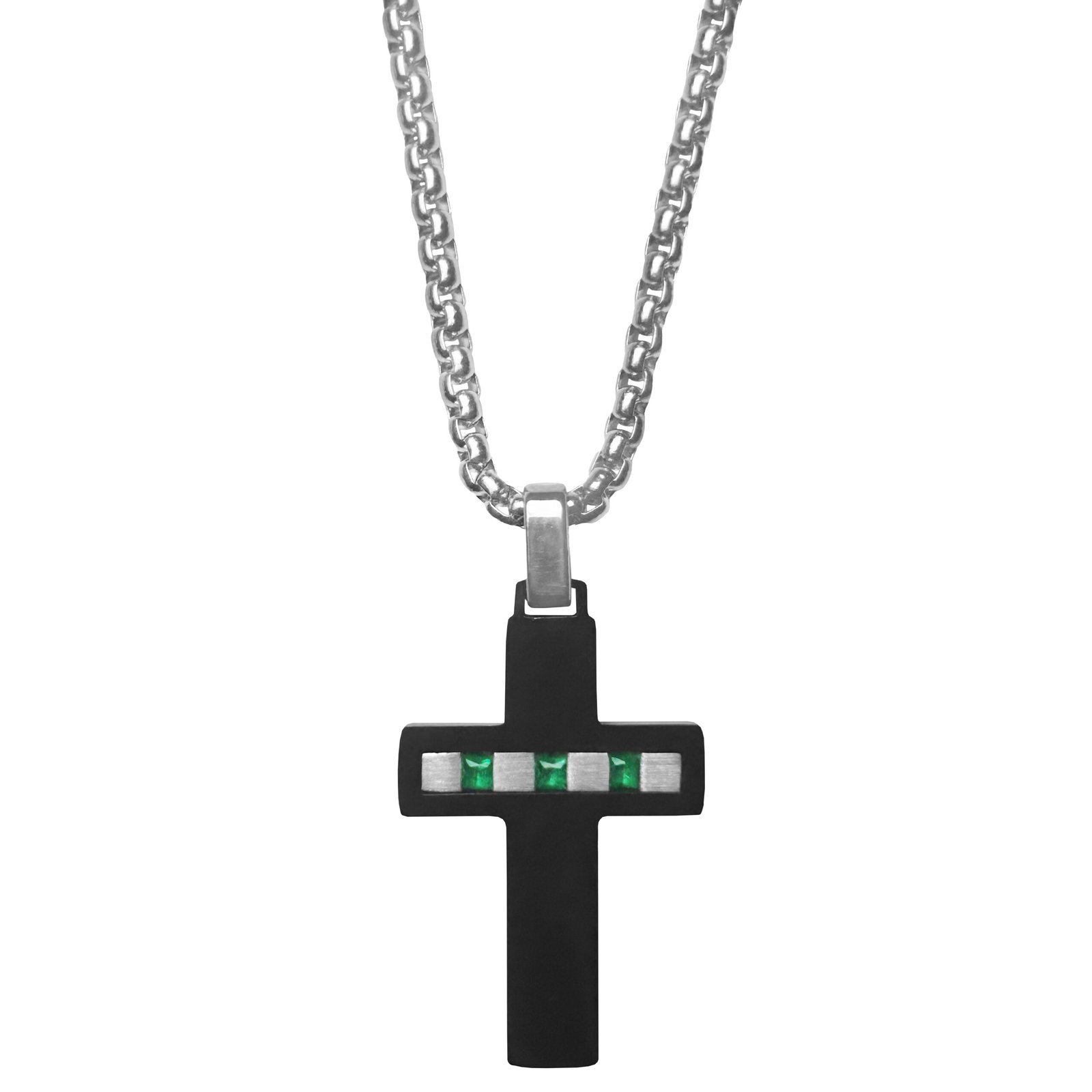 Stainless Steel Cross w/ Three Green CZ Stones Necklace