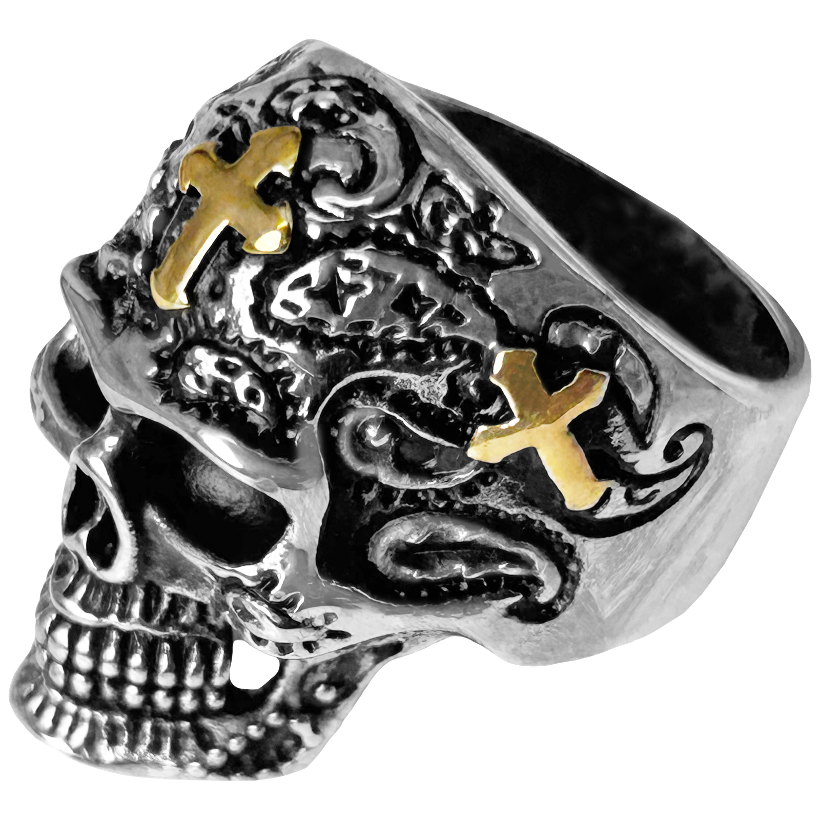 Stainless Steel Day of Dead Skull Ring w/ Gold Crosses