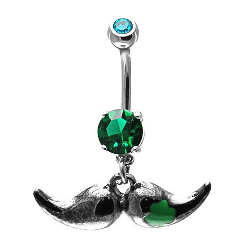 Stainless Steel Double Jeweled Navel Ring with Dangling Mustache and Green Clover Design.