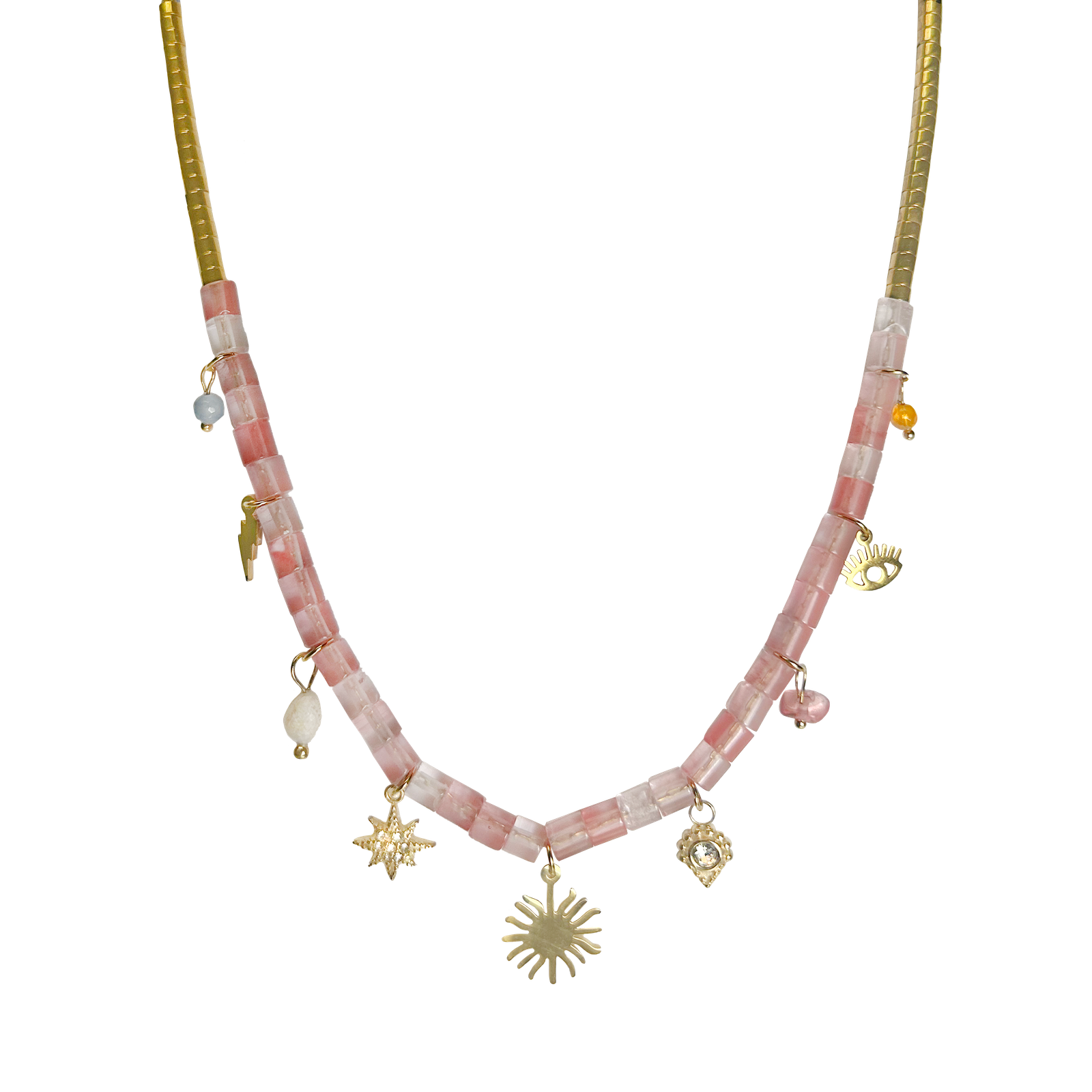 Stainless Steel Gold Chain with Light Pink Beads with Charms