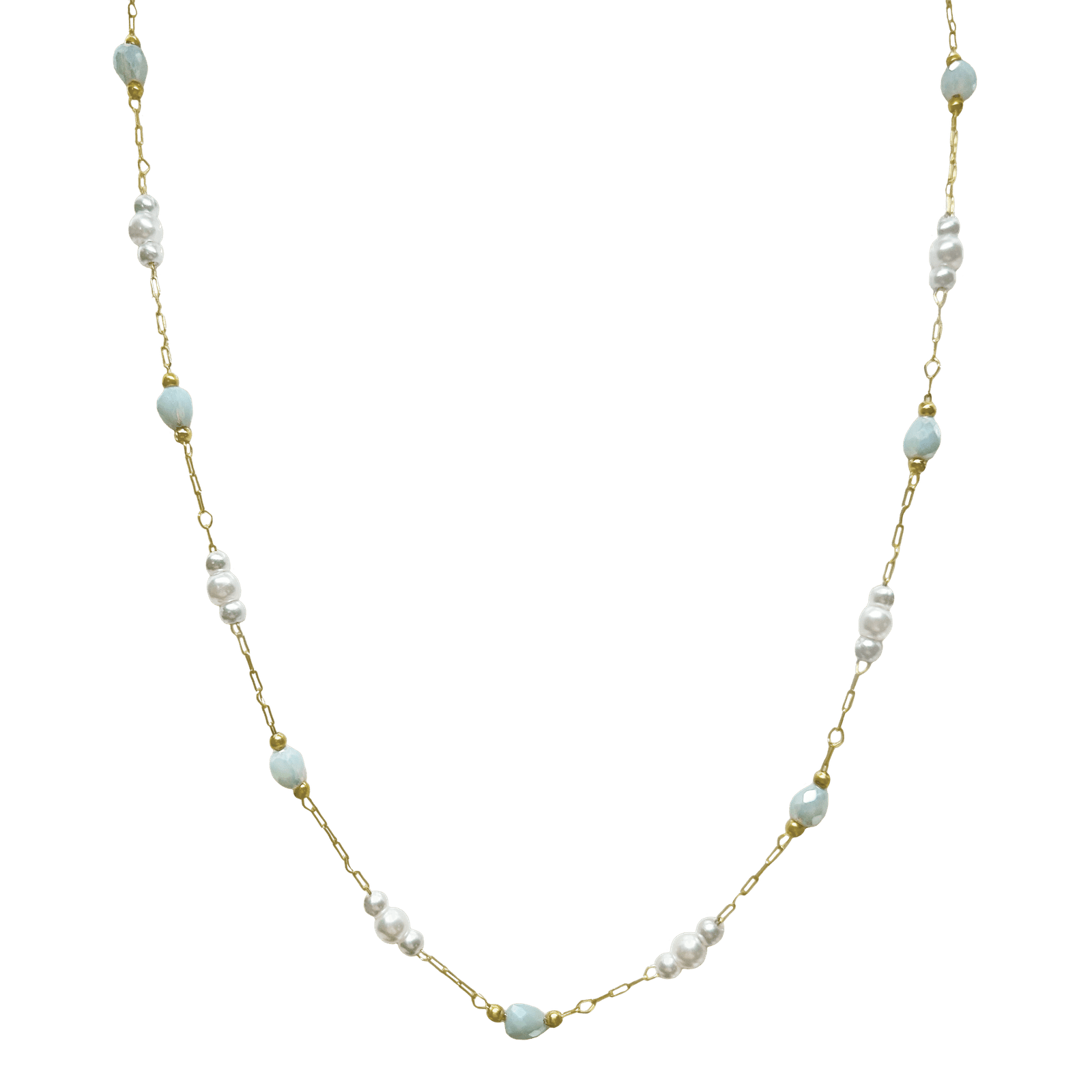 Stainless Steel Gold Pvd Chain Necklace w/ Light Blue Stones & Pearls