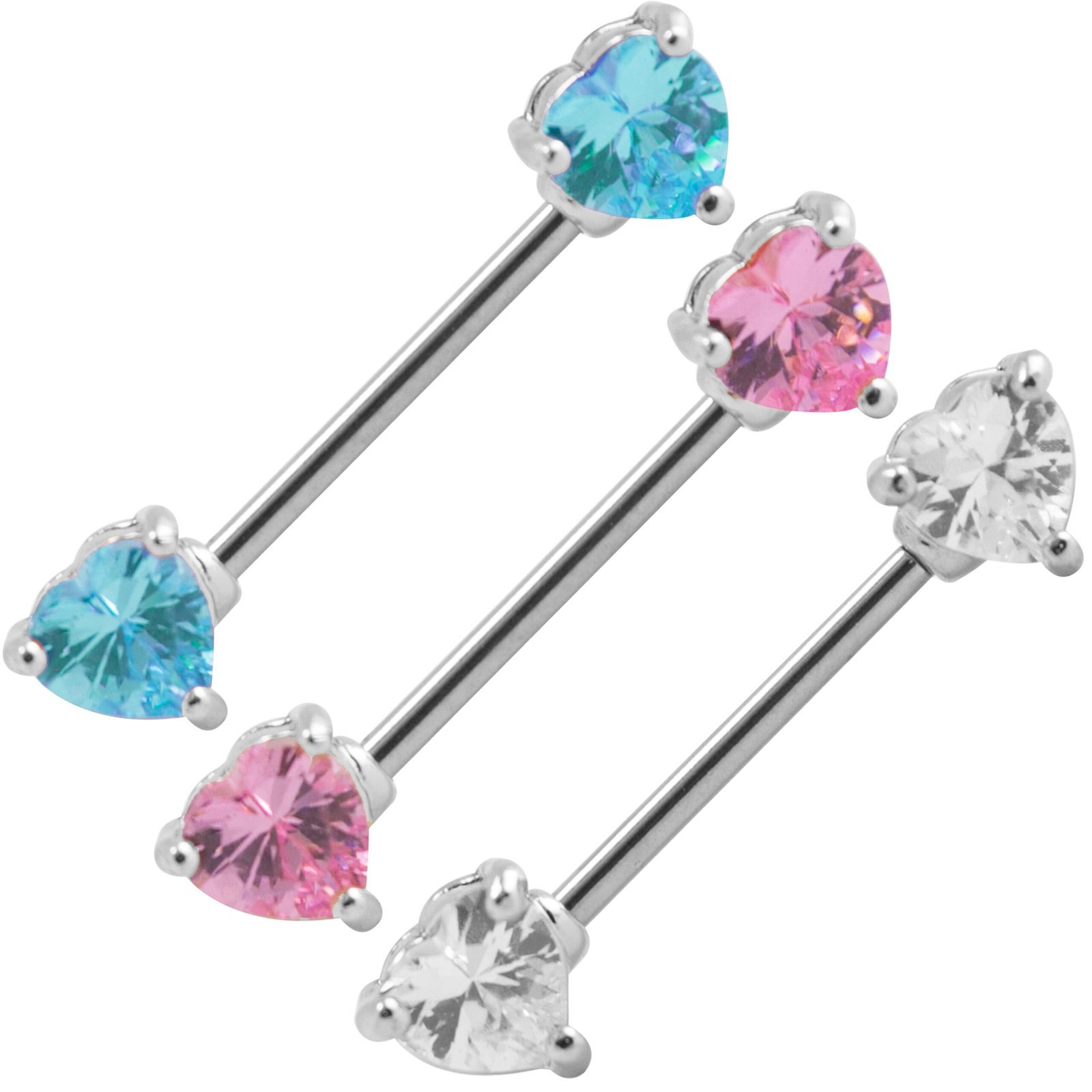 Stainless Steel Heart Shaped Prong Set Double Jeweled Nipple Barbell. Three Colors to Choose From.