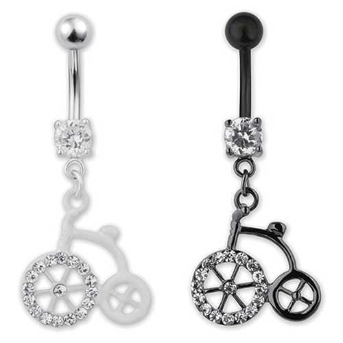 Stainless Steel Jeweled Belly Ring With Dangling Bicycle. This Belly Ring Is Available In Black And White!