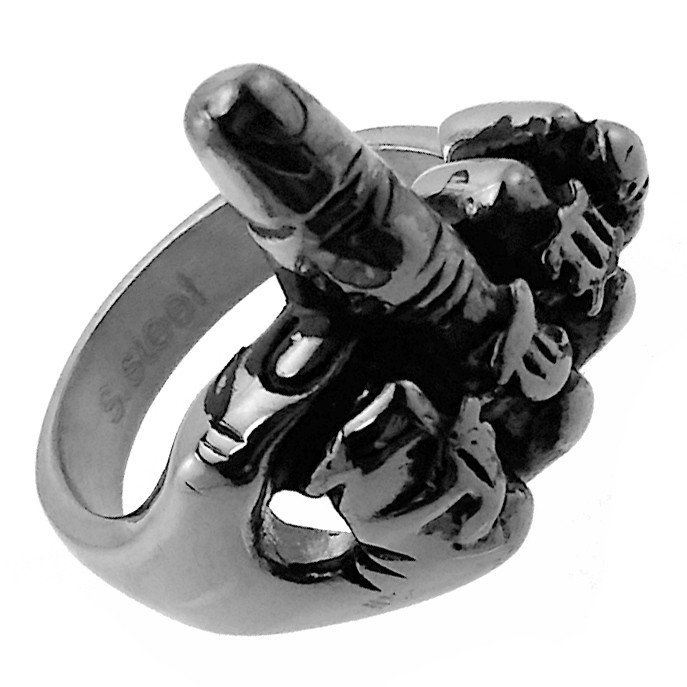 This is a Ring in Stainless Steel with the shape of a hand giving the famous “Middle Finder” the Hand also have inscriptions in the way if tiny rings.