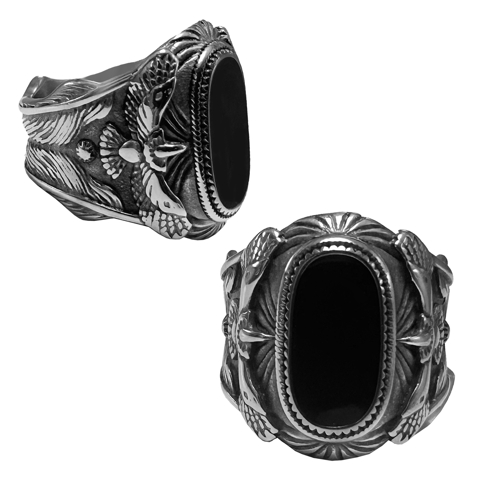 Stainless Steel Ring with Black Oval Cabochon and Flying Eagle