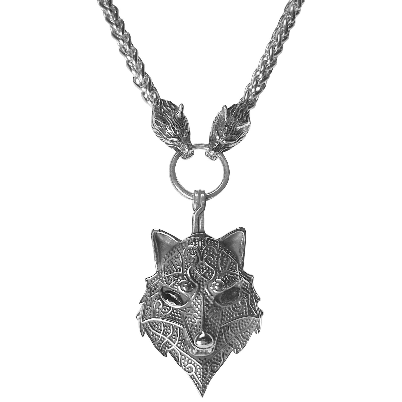 Stainless Steel Wolf Head Necklace w/ Mini Wolves on Wheat Chain
