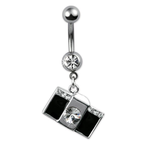 Surgical Steel Body Piercing Jeweled Belly Ring with Black Camera and Clear CZ