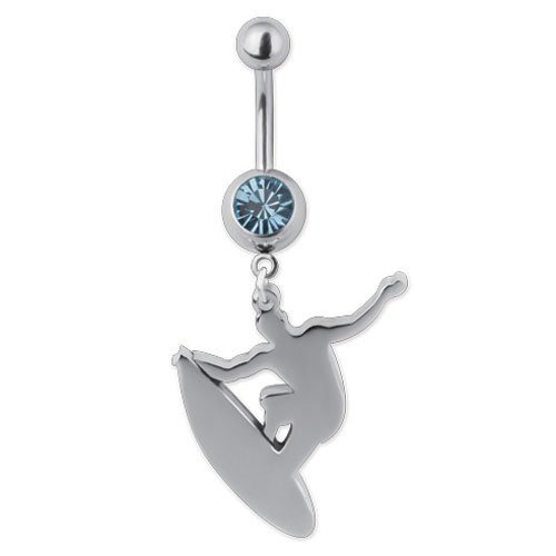 Single Stone Belly Ring With Dangle Surfer and Surfboard