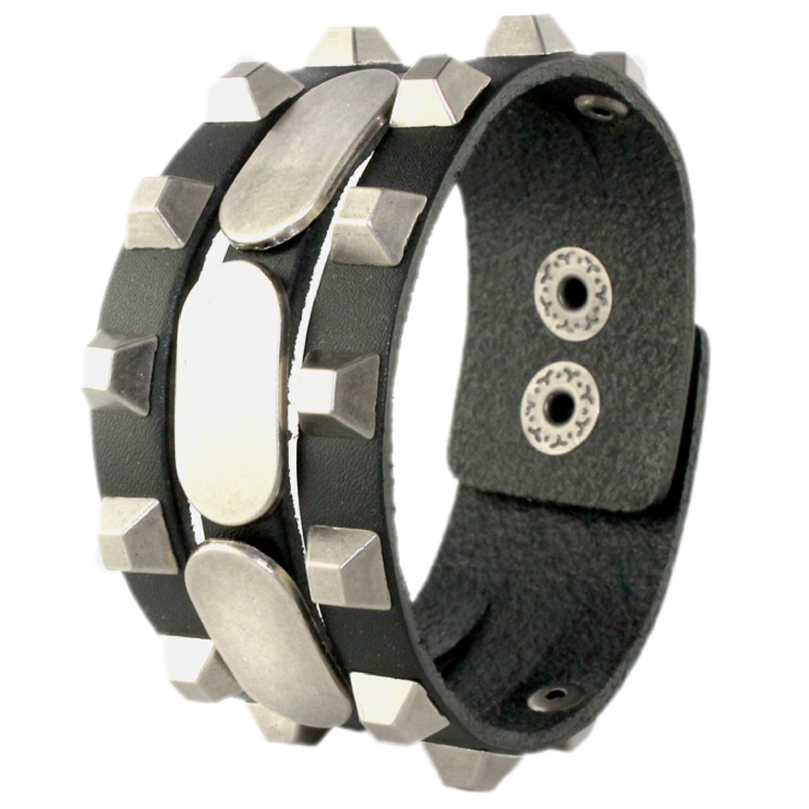 This stylish bracelet is a hit with the biker demographic, featuring three steel tone plates surrounded by pyramid studs. Comes with two push snap buttons for easy size adjustment.