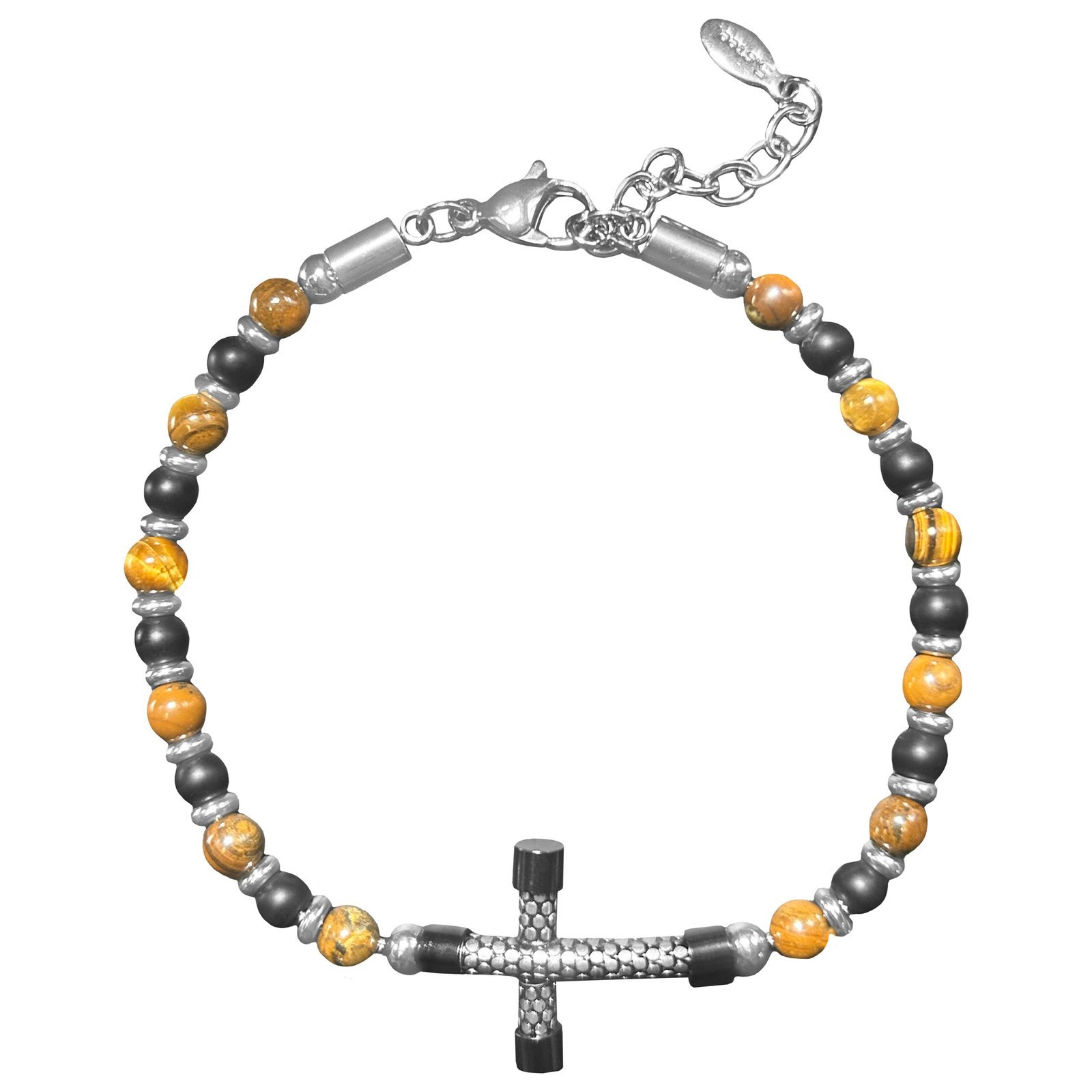 Tiger Eye & Black Natural Stone Bead Bracelet w/ Cross